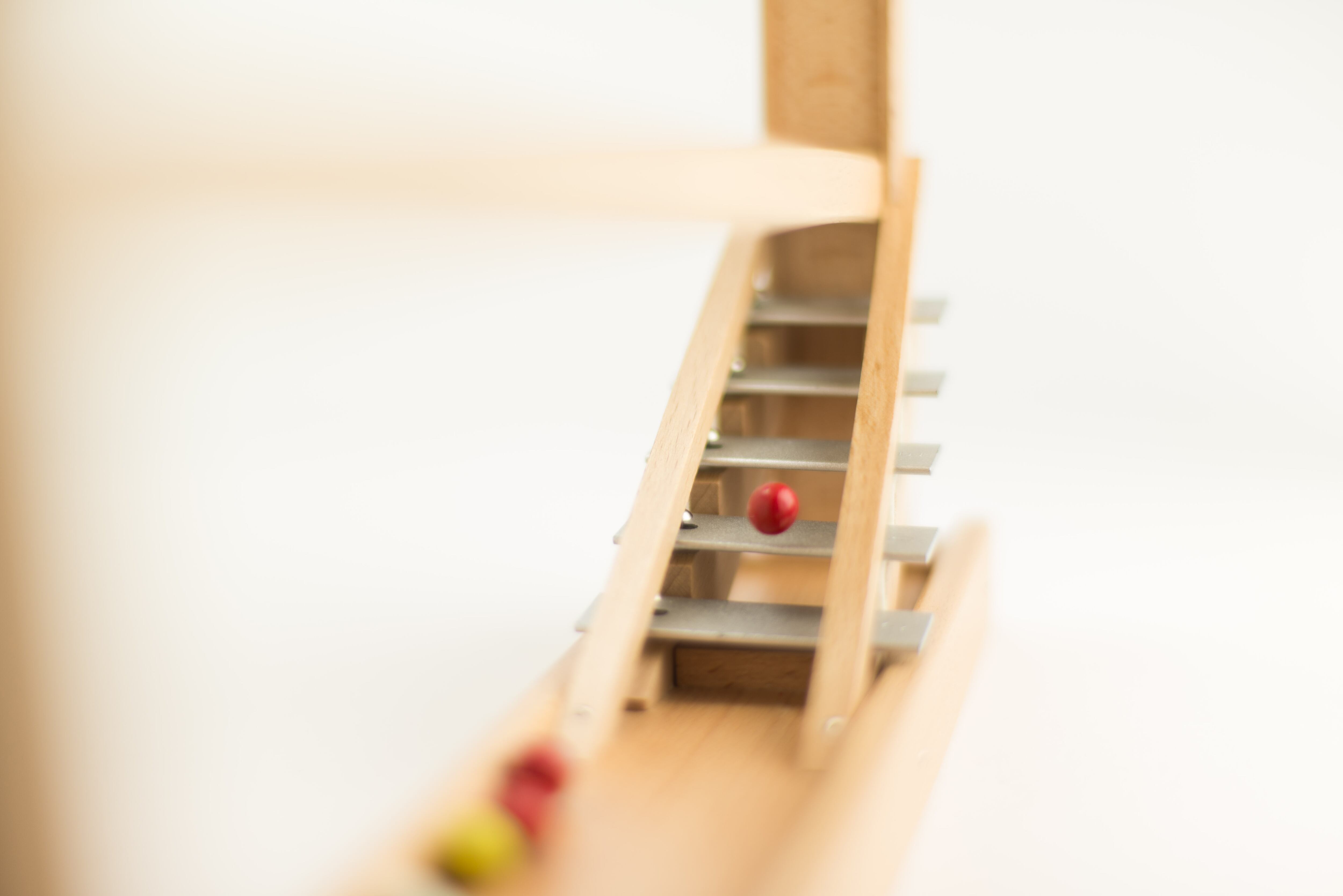 その小さな玉は鉄琴(シロフォン)の階段を通る時、美しい音色を奏でます。